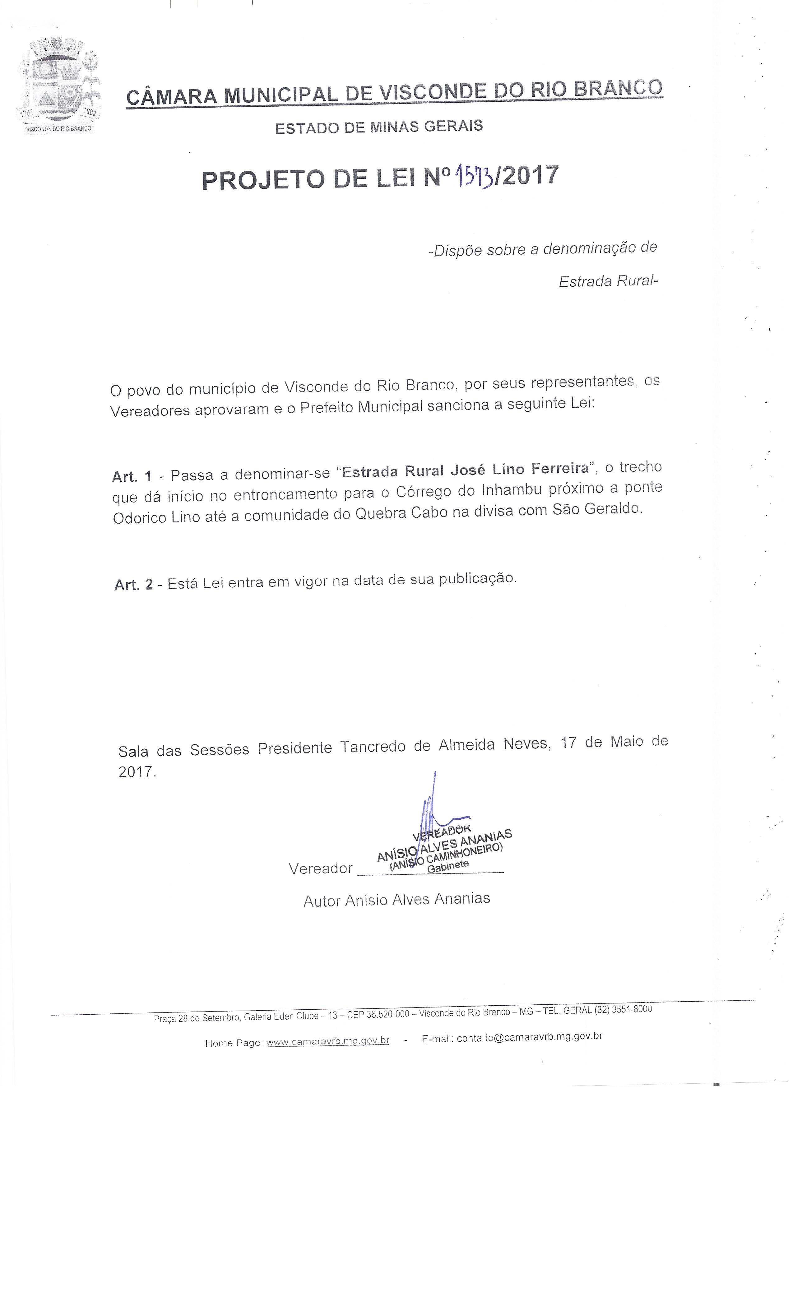Projeto de Lei Ordinária nº 1573 de 2017